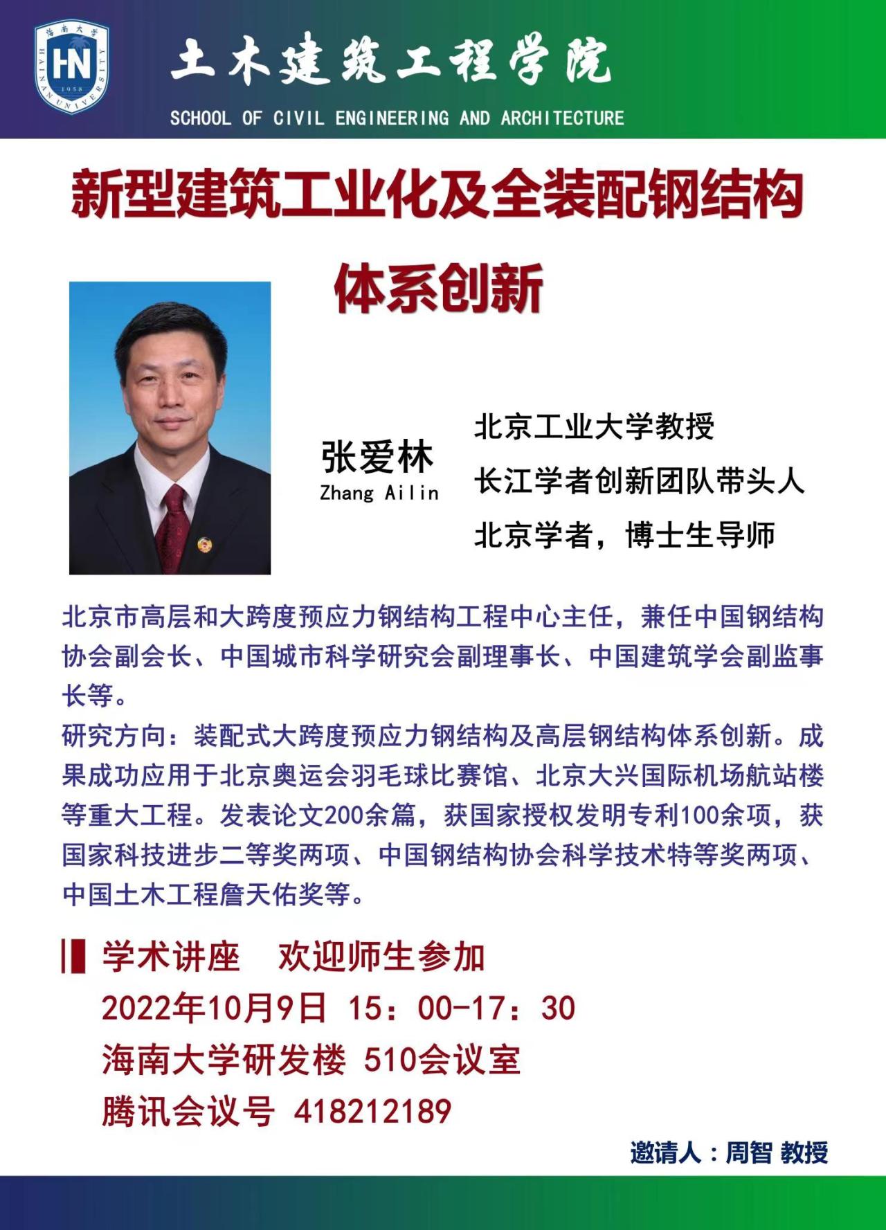 10月9日(周日)下15:00-17:30 点在best365足球官网研发楼510,北京工业大学张爱林 教授在best365做《新型建筑工业化及全装配钢结构体系创新》学术报告。请有兴趣的老师和研究生通过线上同步方式参加。