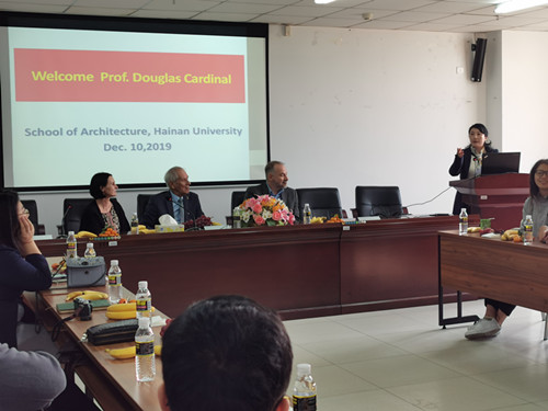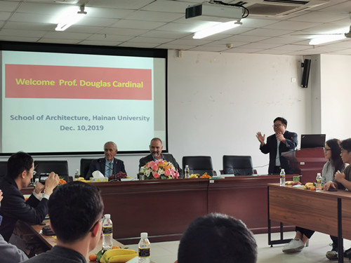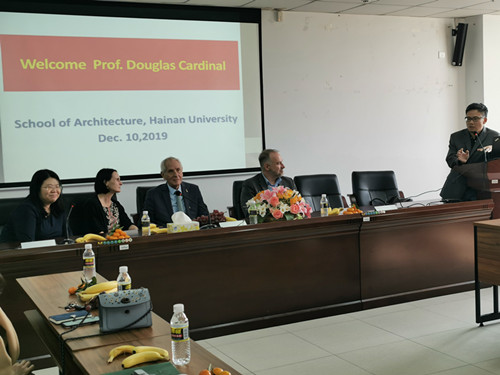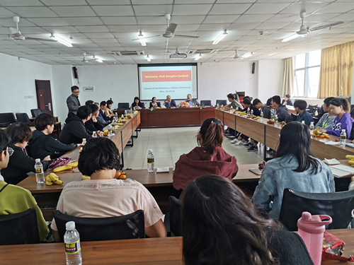 2019年12月10日上午,研发楼510报告厅,建筑系师生齐聚一堂,热情洋溢地同加拿大知名建筑师道格拉斯先生、道格拉斯夫人以及助理马克先生等3人一行举行了一场精彩的茶话座谈会。座谈会由建筑系张华立老师主持,best365足球官网周智院长致欢迎词,建筑系系主任夏桂平向道格拉斯先生一行介绍了建筑系的办学情况,并期待道格拉斯先生大力支持建筑系办学并展望国际合作未来。座谈会上,道格拉斯先生优雅而坦诚地介绍了他个人的创作理念和设计手法,并向师生们展示讲解了大量他个人的设计建成作品。有机而灵动的作创思路并结合在地自然环境和人文环境,道格拉斯每一个作品都深深地吸引并打动了在场的每一位师生。座谈期间,老师和同学们热切地同道格拉斯先生互动交流,在有限的两个小时内,期望向道格拉斯先生学到更多的设计与创作智慧。