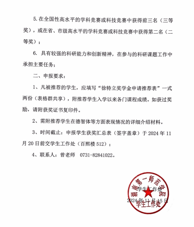 2024年度徐特立教育基金会“优秀学生奖”评选方案