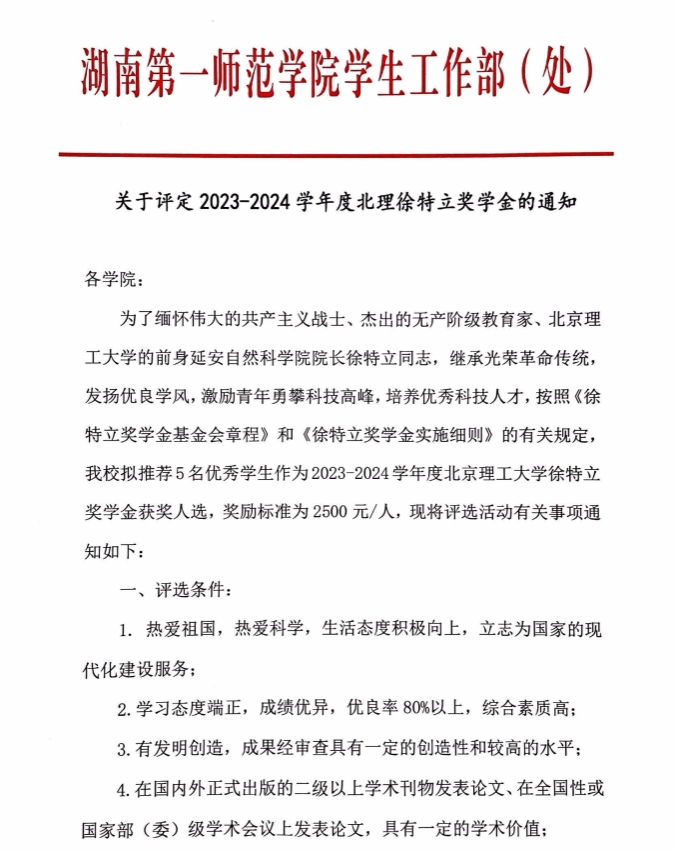 关于评定2023-2024学年度北理徐特立奖学金的通知